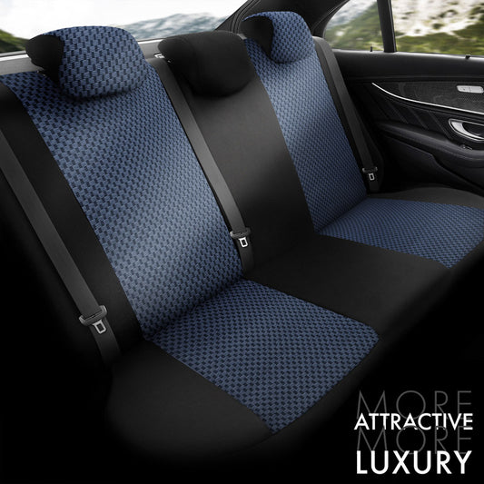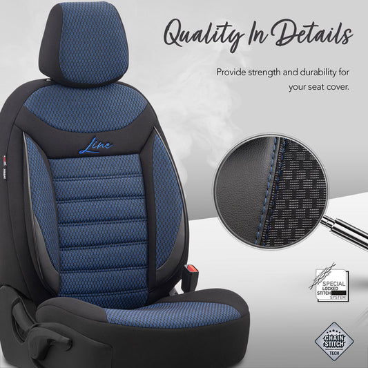 Complete universele stoelhoezenset Line zwart - blauw voor de voorstoelen en achterbank. Zeer luxe en dikke kwaliteit stof.