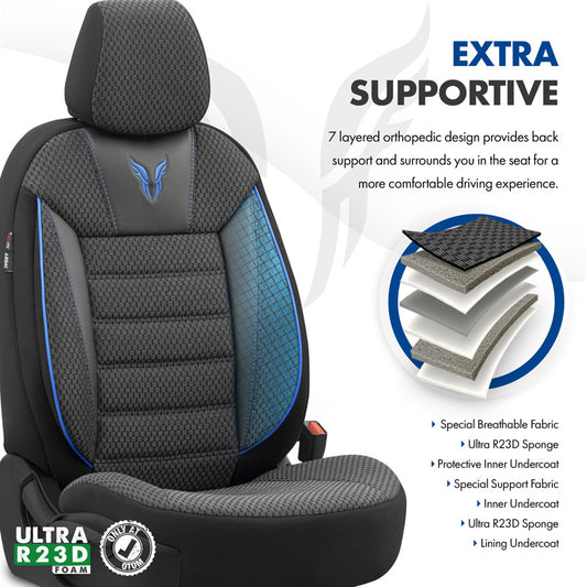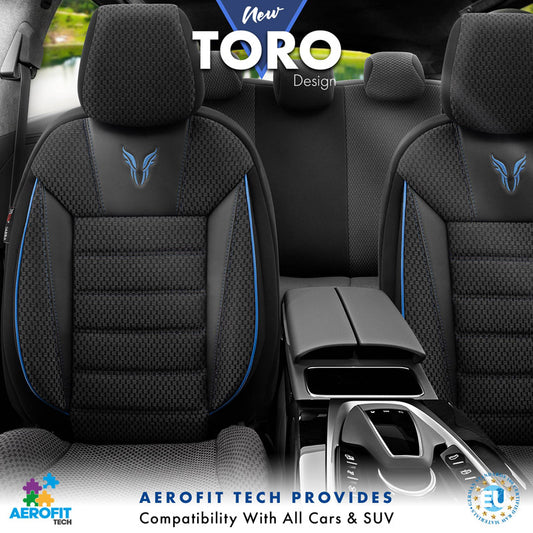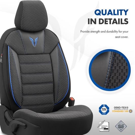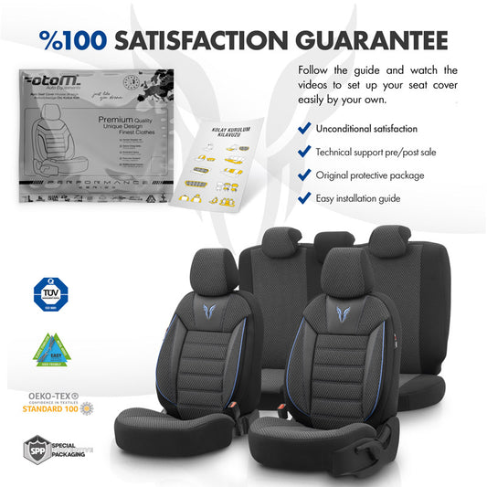Complete universele stoelhoezenset Toro zwart - blauw voor de voorstoelen en achterbank. Zeer luxe en dikke kwaliteit stof.