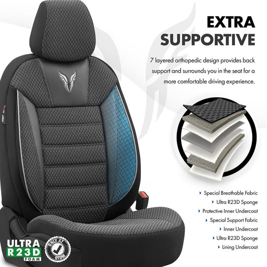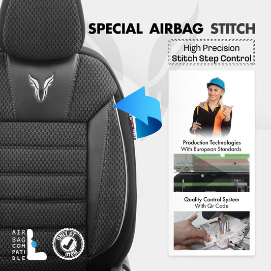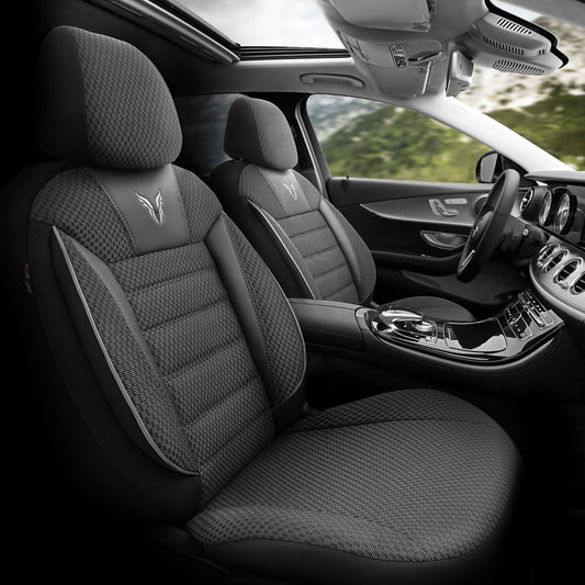Complete universele stoelhoezenset Toro zwart - grijs voor de voorstoelen en achterbank. Zeer luxe en dikke kwaliteit stof.