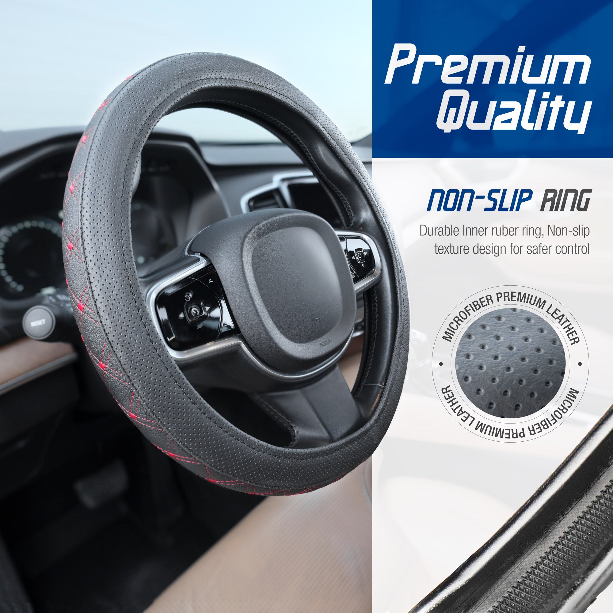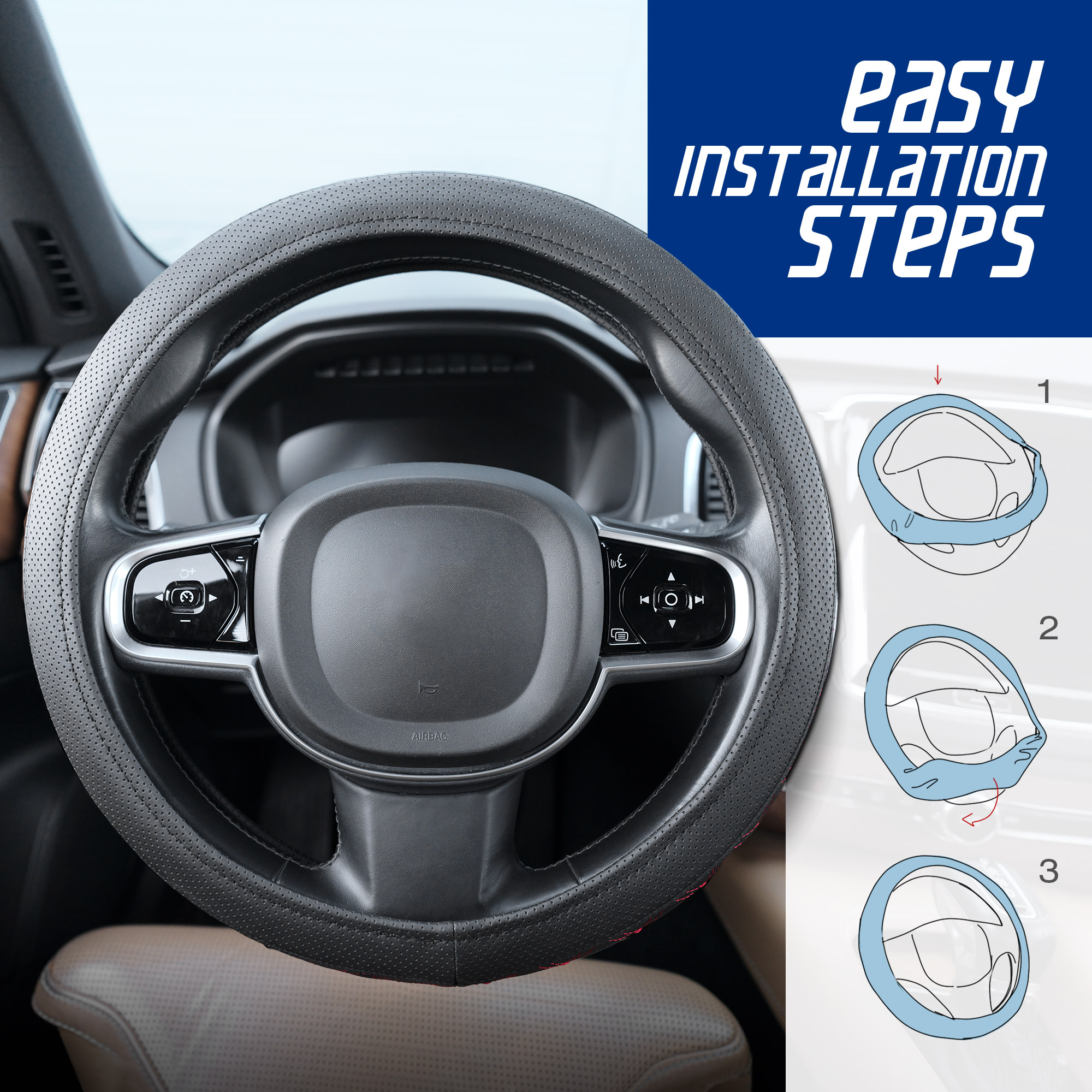 Stuurhoes van zwart kunstleer met blauw stiksel