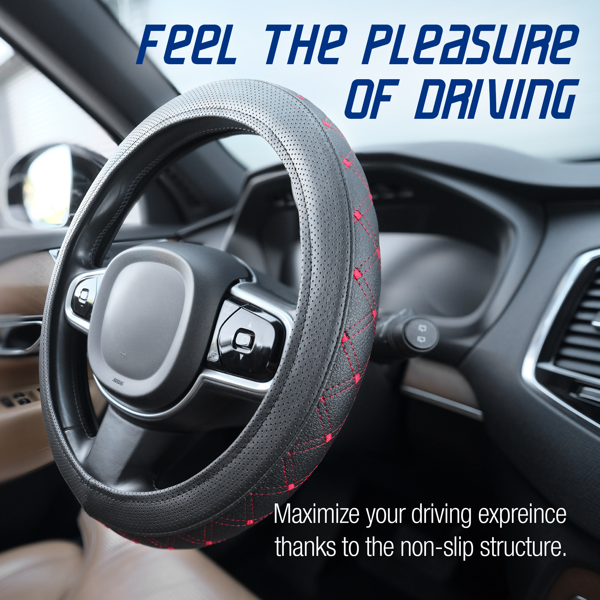 Stuurhoes van zwart kunstleer met rood stiksel