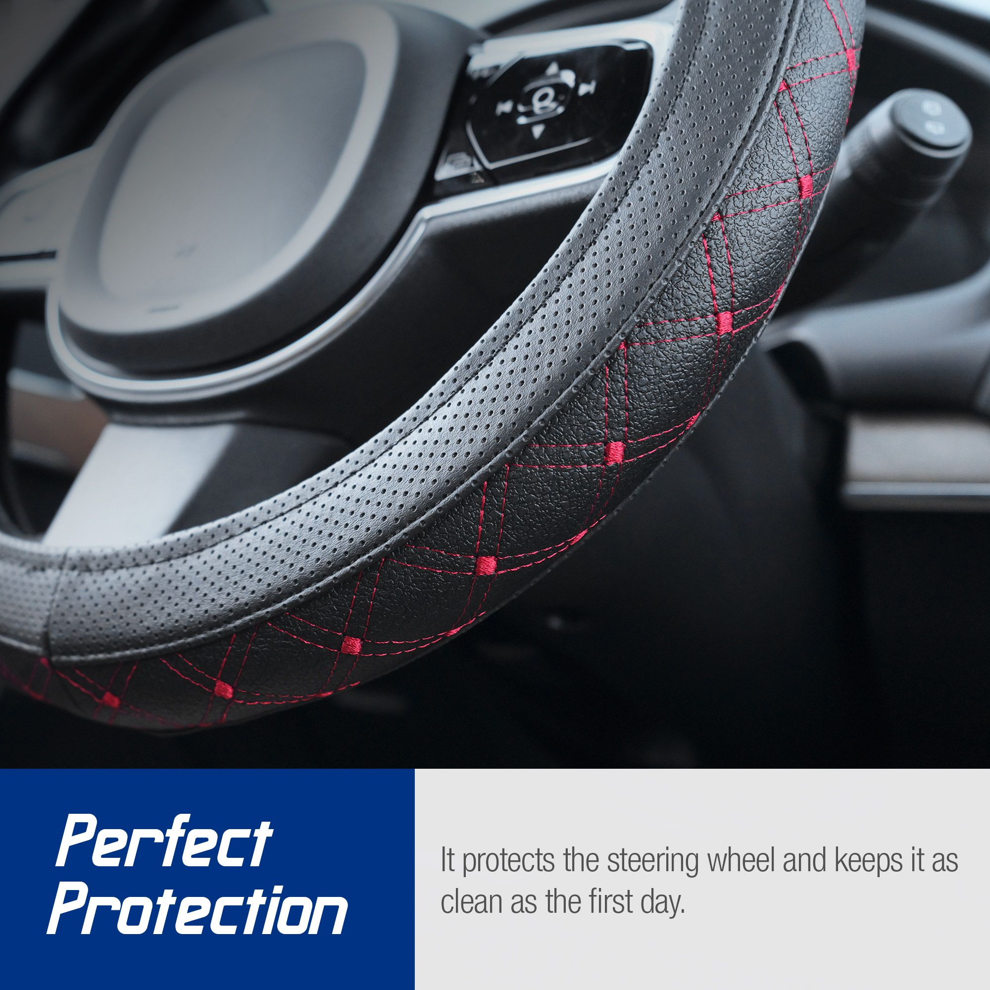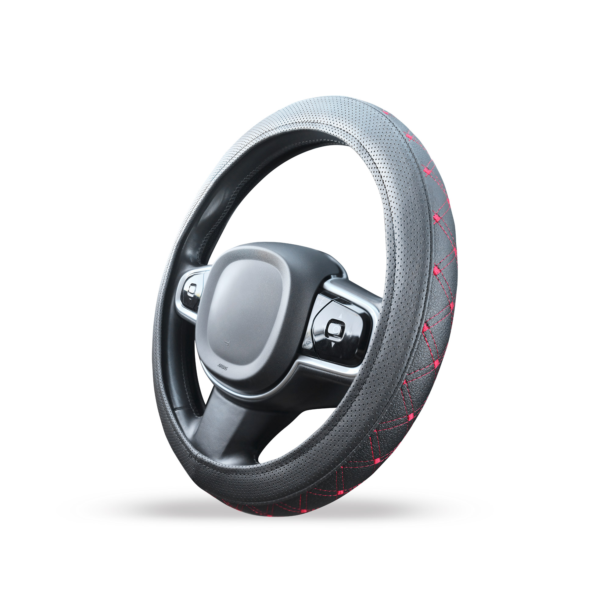 Stuurhoes zwart geperforeerd kunstleer met rood stiksel: