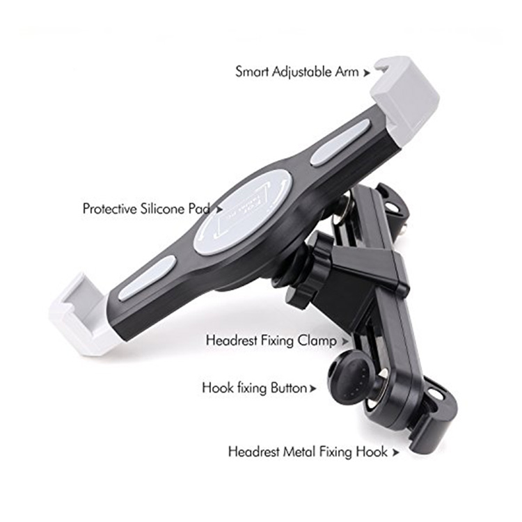 Tablethouder voor in de auto met 2 opties om te monteren. Een die je eenvoudig bevestigd aan de stangetjes van de hoofdsteun, of met zuignap op de ruit. De houder heeft rubber grip achterkant met 2 punts sluiting zodat je met een gerust hart je tablet kunt monteren.