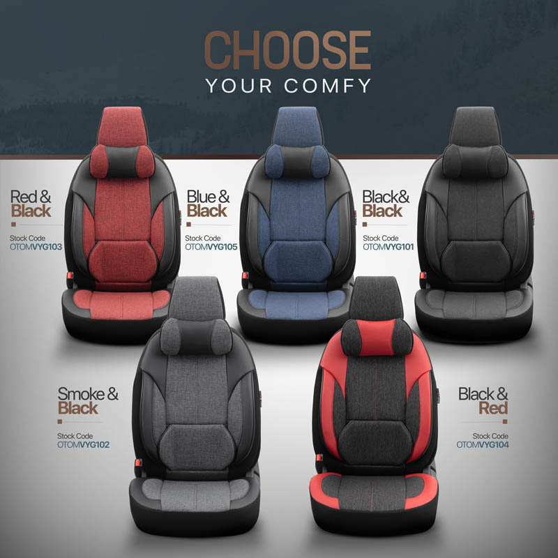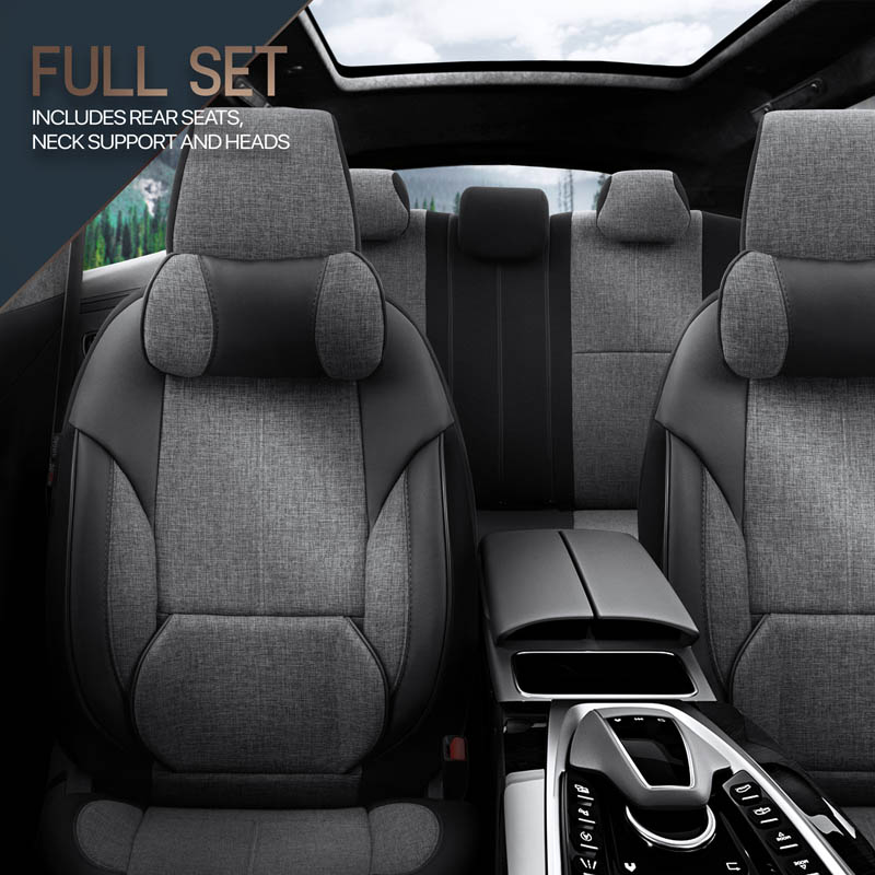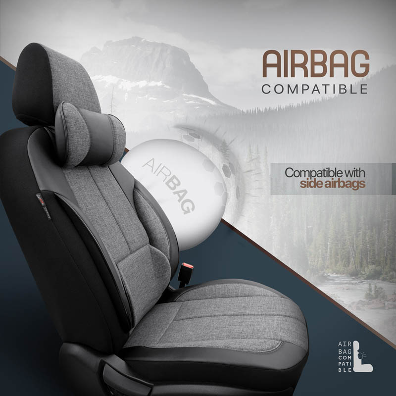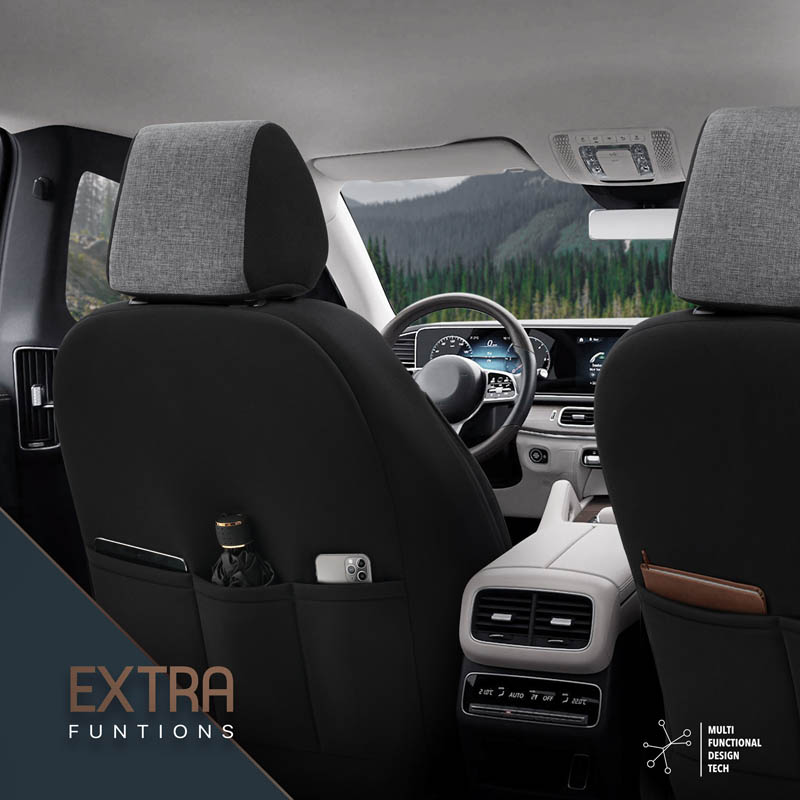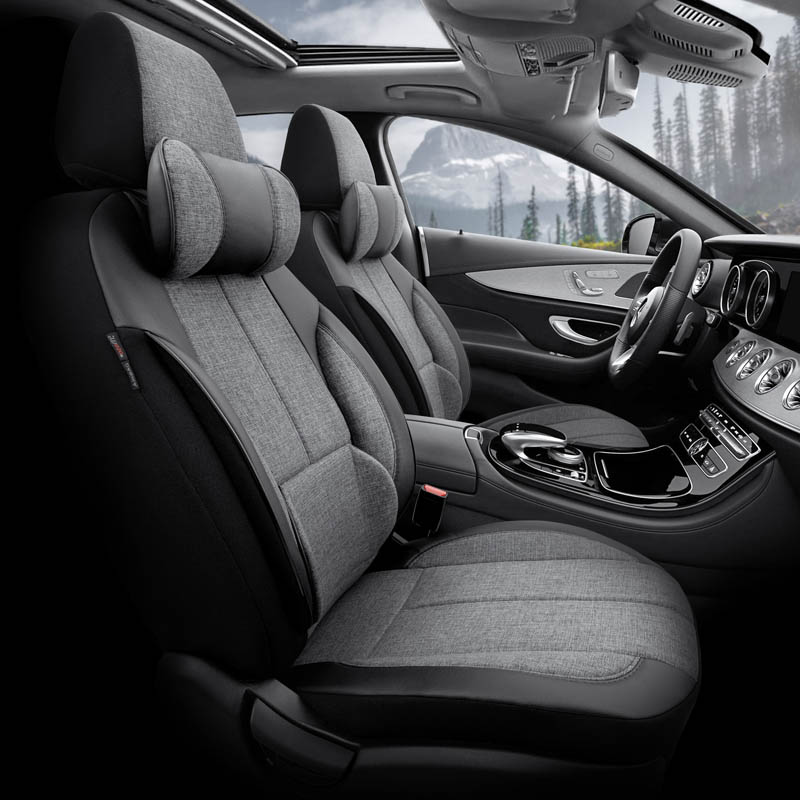 Complete universele stoelhoezenset Voyager donkergrijs - zwart voor de voorstoelen en achterbank, inclusief nekkussen. Super comfortabele en luxe set van stof en kunstleer.