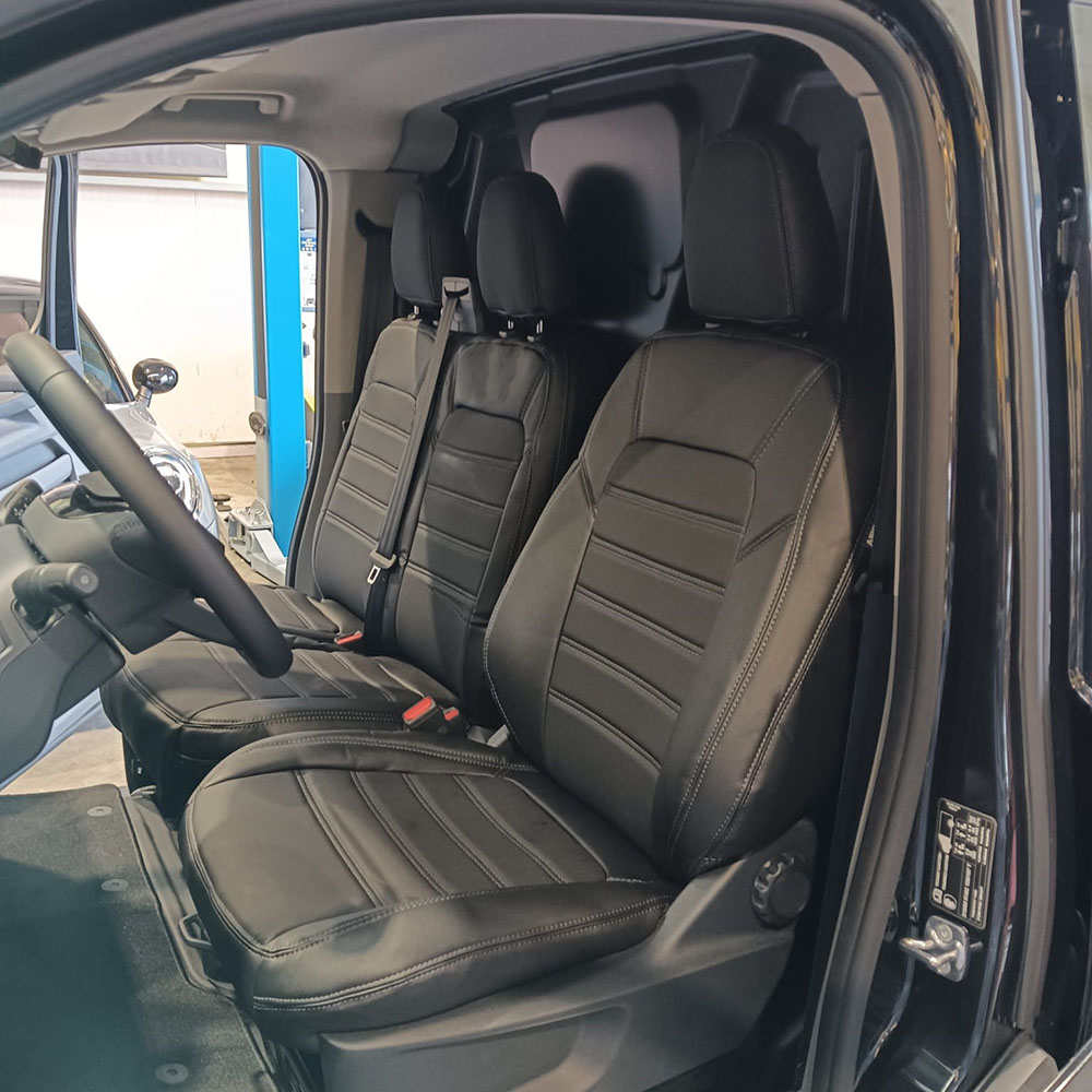 Kunstleer pasvorm stoelhoezen set (bestuurder en passagier). Speciaal voor Ford Transit Custom 2023-heden / Volkswagen Transporter T7 2024-heden - Luxe en sterk, kleur zwart met grijs stiksel.