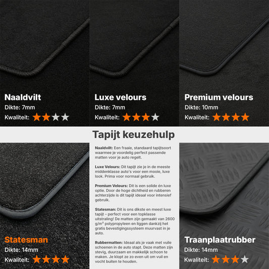 - Premium Velours - Hogere dichtheid en luxe afwerking, geschikt voor intensief gebruik.
